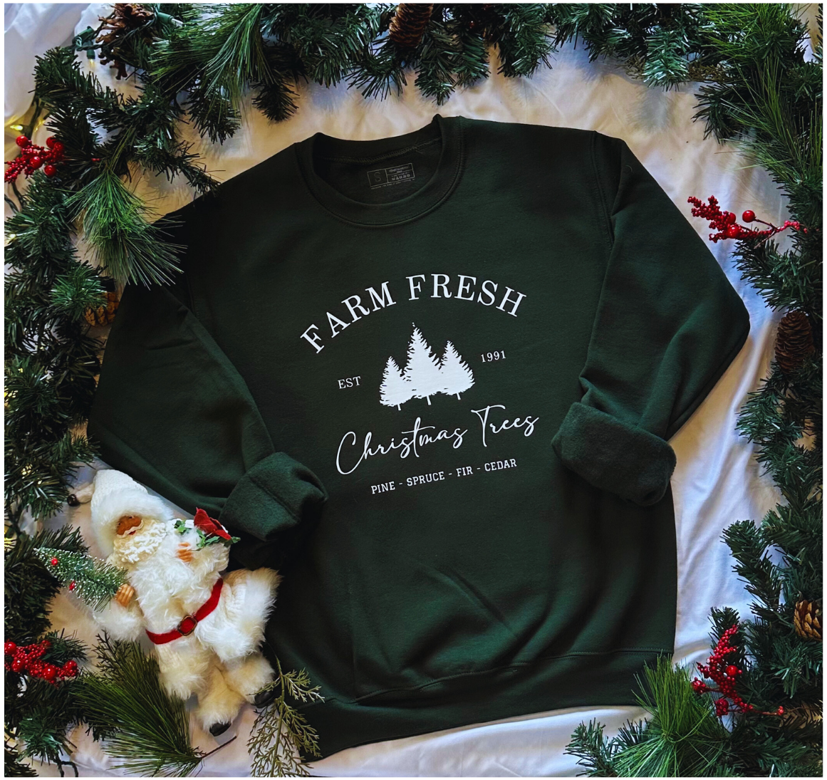 • Farm Fresh Christmas Trees Sweatshirt (unisex fit; soft, cozy, rustic farmhouse vibes)